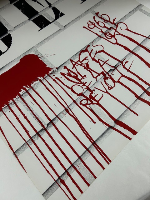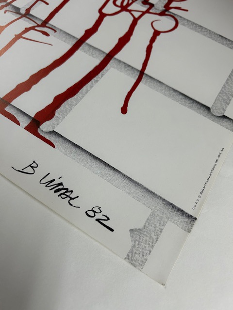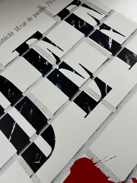 こちらのポスターはリトグラフになります。リトグラフ(lithograph):平板印刷の一種で油(インク)の撥水性を利用した印刷方法です。オフセット印刷の原型となる印刷方法で、元々は石(=リト)を原版に使用した為リトグラフと呼ばれますが、現在はより扱いに適したアルミ版が多く使われています。細かい筆致やインクの飛沫など原版の表現を損なう事無く印刷できるのが特徴です。