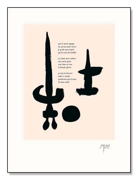 ジョアン ミロ スペイン【1893-1983】スペイン・カタルーニャ地方出身の芸術家と言えばピカソやダリ、ガウディなど錚々たる名前が挙がりますが、その中でも一際独自の光を放つミロ。それはシュルレアリスムの芸術家として知られながらも、他のシュルレアリストの作風とは全く異なる点においても認められます。シュルレアリスムでは古典的・写実的描写が多く用いられましたがミロの描く絵は、対象は見事に変形させられ、色調は激しく彩られ、独創性に満ちたものになっています。しかしそれこそが根元から自然と湧き上がってきたものであり、シュルレアリスムの主唱者アンドレ・ブルトンはその純粋で自由なオートマティスムを持ちうるミロこそが真のシュルレアリストであると述べています。