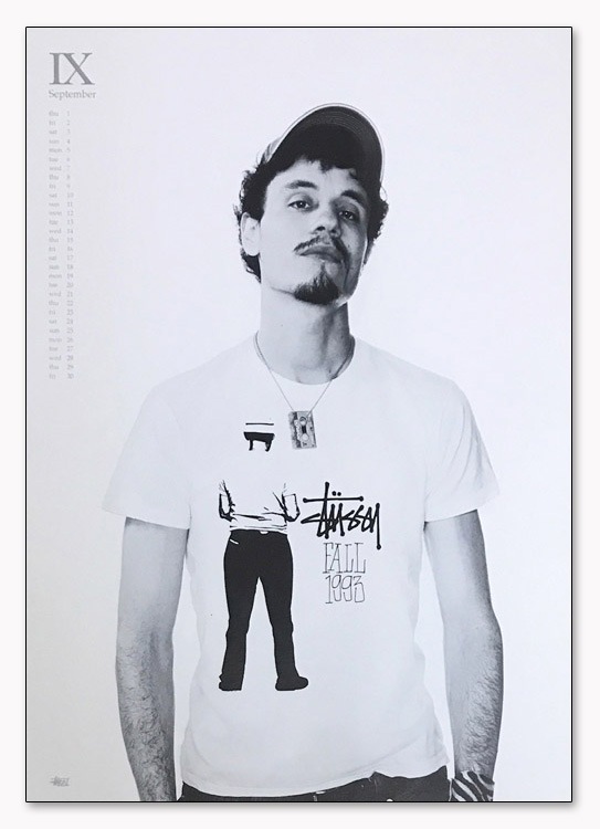 Stussyサーフボードのボードシェイパーをしていた、「ショーン・ステューシー」氏が、アメリカの南カリフォルニア州にて、仲間のためにデザインした数枚のTシャツから、産声を上げた、ストリートブランド!こちらは25周年の限定カレンダーのプリントとなります。
