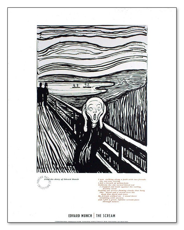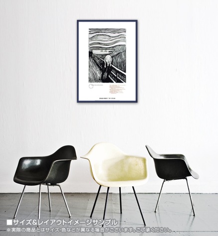 エドヴァルド・ムンク(Edvard Munch 1863年12月12日 - 1944年1月23日)19世紀~20世紀のノルウェー出身の画家。生と死の問題、そして、人間存在の根幹に存在する、孤独、嫉妬、不安などを見つめ、人物画に表現した表現主義的な作風の画家として知られる。エドヴァルドが5歳の時に母が結核のため30歳の若さで死去、1877年には15歳の姉がやはり結核で死去。エドヴァルド自身も虚弱な子供で、生き延びられないのではと心配されていたという。病気や死と直面せざるを得なかったムンクが、「愛」と「死」とそれらがもたらす「不安」をテーマとして制作し、「フリーズ・オブ・ライフ(生命のフリーズ)」と称した作品群のうちの一作であり、『叫び』はその中でも最も有名な作品である。極度にデフォルメされた独特のタッチで描かれた人物、血のように赤く染まったフィヨルドの夕景と不気味な形、赤い空に対比した暗い背景、遠近法を強調した秀逸な構図の作品であるが、この絵は、ムンクが感じた幻覚に基づいており、彼は日記にそのときの体験を次のように記している。「私は2人の友人と歩道を歩いていた。太陽は沈みかけていた。突然、空が血の赤色に変わった。私は立ち止まり、酷い疲れを感じて柵に寄り掛かった。それは炎の舌と血とが青黒いフィヨルドと町並みに被さるようであった。友人は歩き続けたが、私はそこに立ち尽くしたまま不安に震え、戦っていた。そして私は、自然を貫く果てしない叫びを聴いた。」しばしば誤解されるが、「叫び」はこの絵で描かれている人物が発しているのではなく、「自然を貫く果てしない叫び」のことである。この絵は「橋の上の男が叫んでいる」のではなく「橋の上の男が叫びに耐えかねて耳を押さえている」様子を描いた絵である。2012年5月2日、唯一個人所有(ノルウェーの実業家ペッター・オルセン所蔵)であった1点、唯一背景の1人の人物が横を向いた構図になっている絵画が、ニューヨークで競売にかけられ、1億1990万ドル(約96億円、手数料含)で落札された。絵画の競売落札価格としては史上最高額。こちらのポスターはオフセットプリントになります。オフセットプリント(offset):平板印刷の一種で油(インク)の撥水性を利用した科学的な印刷方法です。版から紙へ直接印刷するのではなく中間転写体を介す為、版や紙への摩擦が少なく印刷できるのが大きな特徴です。正確で鮮明な多色刷りの印刷が可能で、原版からの再現性が高い事から現代のカラー印刷では最も広く使われています。