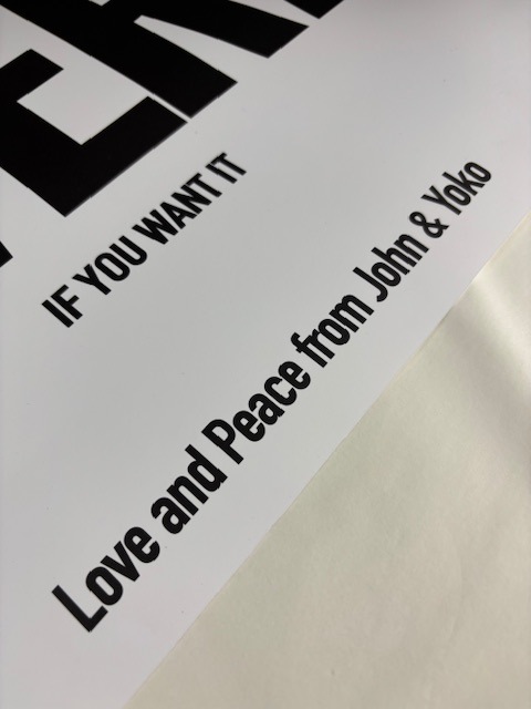 オノ・ヨーコ(Yoko Ono)は、日本生まれのアーティスト、音楽家、平和活動家で、世界的に有名なジョン・レノンの妻としても広く認識されています。1933年2月18日に東京で生まれ、彼女は芸術、音楽、社会的活動の領域で多大な影響を与えてきました。1969年にヨーコ・オノとジョン・レノンによって開始された「War is Over! 」キャンペーンは、彼らの平和のメッセージを世界11の主要都市の看板に掲示することから始まり、続いて同じメッセージを掲載したポスター、チラシ、広告が出されました。ポスターには大きな黒い文字で「WAR IS OVERIF YOU WANT IT Love and Peace from John & Yoko」と書かれています。こちらのポスターはオフセットプリントになります。オフセットプリント(offset):平板印刷の一種で油(インク)の撥水性を利用した科学的な印刷方法です。版から紙へ直接印刷するのではなく中間転写体を介す為、版や紙への摩擦が少なく印刷できるのが大きな特徴です。正確で鮮明な多色刷りの印刷が可能で、原版からの再現性が高い事から現代のカラー印刷では最も広く使われています。