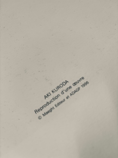 黒田 アキ 日本 【1944-】 京都府の出身で現在はパリ在住、ヨーロッパを中心に活動しながら世界的な評価を得ているクロダアキ。様々な主義・派・形式・様式など、ある意味開拓されつくした感のある今日の絵画というフィールドの中で現代作家たちの一つの命題ともなっている「絵画の終わり方」というものに彼もまた果敢に挑み続けています。一見秩序を保った、安定した構成の中に汲み取れる不安定な要素は、矛盾した世界で震える現代社会への警鐘のようです。そしてその絵には警鐘のみならず、回答にも似たメタファーもまた描かれているのです。こちらのポスターはリトグラフになります。リトグラフ(lithograph):平板印刷の一種で油(インク)の撥水性を利用した印刷方法です。オフセット印刷の原型となる印刷方法で、元々は石(=リト)を原版に使用した為リトグラフと呼ばれますが、現在はより扱いに適したアルミ版が多く使われています。細かい筆致やインクの飛沫など原版の表現を損なう事無く印刷できるのが特徴です。