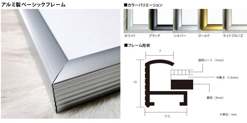 人気のアルミ製ベーシックフレームにて額装しました。(※フレームの種類は変更できませんので、何卒ご了承ください。)こちらのポスターはオフセットプリントになります。オフセットプリント(offset):平板印刷の一種で油(インク)の撥水性を利用した科学的な印刷方法です。版から紙へ直接印刷するのではなく中間転写体を介す為、版や紙への摩擦が少なく印刷できるのが大きな特徴です。正確で鮮明な多色刷りの印刷が可能で、原版からの再現性が高い事から現代のカラー印刷では最も広く使われています。