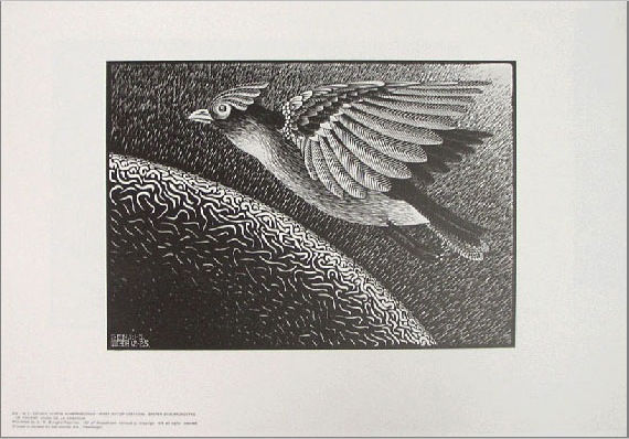 MC エッシャー オランダ 【1898-1972】 エッシャーの作品の最大の特徴は、だまし絵としての空間と非常に数学的・結晶学的なアプローチで描かれた構図にあります。そのタッチから寓話的なイメージも受けますが、そのようなイメージをエッシャー自身はひどく嫌っており、生涯を賭して彼は職人的に「平面の正則分割」「鏡面」「遠近法」など理工的な世界の構築を探究しつづけました。それでも彼の人間性までもが数学的・理工的であった訳ではなく、自然社会に存在する動植物などが作品の多くのモチーフになっており、エッシャーの豊かな人間性が汲み取れます。