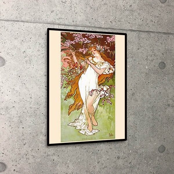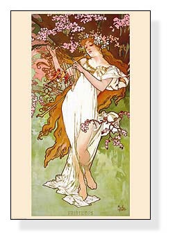 アルフォンス マリア ミュシャ チェコ【1860-1939】19世紀末、ヨーロッパを中心に花開いた装飾美術の運動アール・ヌーボーを代表する芸術家ミュシャ。装飾パネルとして売り出されたシリーズのひとつ。この四季のシリーズは大変人気があり、ベストセラーになりました。四つの季節がそれぞれ女性像で表されているようです。春の図ではブロンド(金髪)の女性が青い枝と自らの髪の毛で竪琴を作っており、それを小鳥たちが眺めている様が伺えます。
