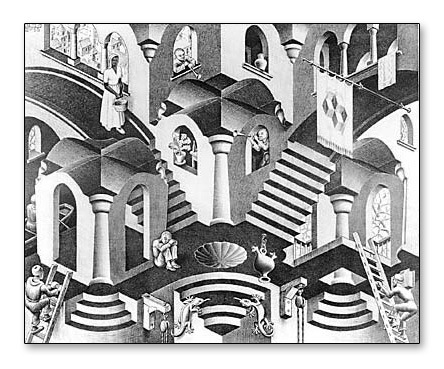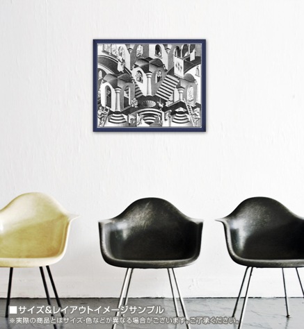 MC エッシャー オランダ 【1898-1972】 エッシャーの作品の最大の特徴は、だまし絵としての空間と非常に数学的・結晶学的なアプローチで描かれた構図にあります。そのタッチから寓話的なイメージも受けますが、そのようなイメージをエッシャー自身はひどく嫌っており、生涯を賭して彼は職人的に「平面の正則分割」「鏡面」「遠近法」など理工的な世界の構築を探究しつづけました。それでも彼の人間性までもが数学的・理工的であった訳ではなく、自然社会に存在する動植物などが作品の多くのモチーフになっており、エッシャーの豊かな人間性が汲み取れます。