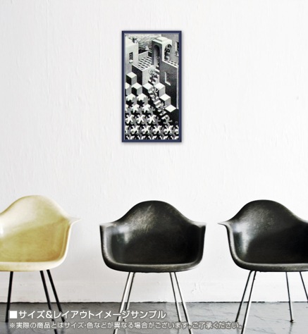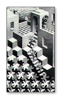 MC エッシャー オランダ 【1898-1972】 エッシャーの作品の最大の特徴は、だまし絵としての空間と非常に数学的・結晶学的なアプローチで描かれた構図にあります。そのタッチから寓話的なイメージも受けますが、そのようなイメージをエッシャー自身はひどく嫌っており、生涯を賭して彼は職人的に「平面の正則分割」「鏡面」「遠近法」など理工的な世界の構築を探究しつづけました。それでも彼の人間性までもが数学的・理工的であった訳ではなく、自然社会に存在する動植物などが作品の多くのモチーフになっており、エッシャーの豊かな人間性が汲み取れます。