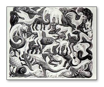 MC エッシャー オランダ 【1898-1972】 エッシャーの作品の最大の特徴は、だまし絵としての空間と非常に数学的・結晶学的なアプローチで描かれた構図にあります。そのタッチから寓話的なイメージも受けますが、そのようなイメージをエッシャー自身はひどく嫌っており、生涯を賭して彼は職人的に「平面の正則分割」「鏡面」「遠近法」など理工的な世界の構築を探究しつづけました。それでも彼の人間性までもが数学的・理工的であった訳ではなく、自然社会に存在する動植物などが作品の多くのモチーフになっており、エッシャーの豊かな人間性が汲み取れます。