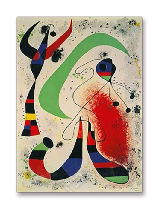 ジョアン ミロ スペイン【1893-1983】スペイン・カタルーニャ地方出身の芸術家と言えばピカソやダリ、ガウディなど錚々たる名前が挙がりますが、その中でも一際独自の光を放つミロ。それはシュルレアリスムの芸術家として知られながらも、他のシュルレアリストの作風とは全く異なる点においても認められます。シュルレアリスムでは古典的・写実的描写が多く用いられましたがミロの描く絵は、対象は見事に変形させられ、色調は激しく彩られ、独創性に満ちたものになっています。しかしそれこそが根元から自然と湧き上がってきたものであり、シュルレアリスムの主唱者アンドレ・ブルトンはその純粋で自由なオートマティスムを持ちうるミロこそが真のシュルレアリストであると述べています。