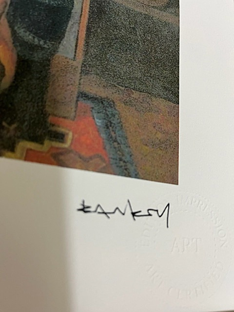イギリスのロンドンを中心に活動する覆面芸術家。グラフィティアート、ストリートアートを世界各地にゲリラ的に描くという手法を取る。Banksy本人は自分のプロフィールを隠そうとしており、本名をはじめとして不明な点が多い。2005年、自作を世界各国の有名美術館の人気のない部屋にゲリラ展示し、しばらくの間誰にも気づかれないまま展示され続けたことが話題となりました。彼の作品の多くは街頭(壁面)などに描かれており、ただの落書きだと考える市当局による清掃などの際に消えてしまう例[1]が頻発している。この様に彼の作品は「落書き」だと思う者は多いが、2007年2月に行われたサザビーズ主催のオークションではバンクシーの作品計6点が落札予想価格を大幅に上回る総額37万2千ポンド(日本円で約8500万円以上)で落札されています。 ※こちらの作品は型押し証明書と手書きナンバリングの入った貴重な作品となります。