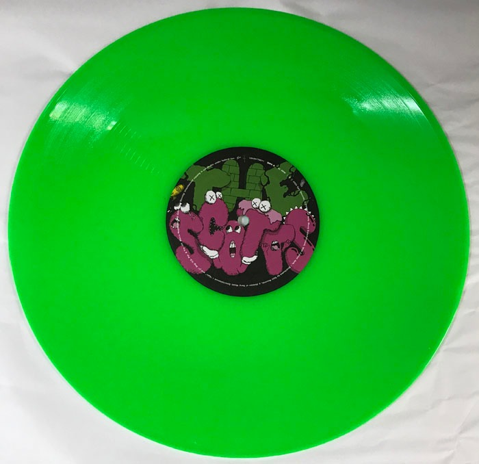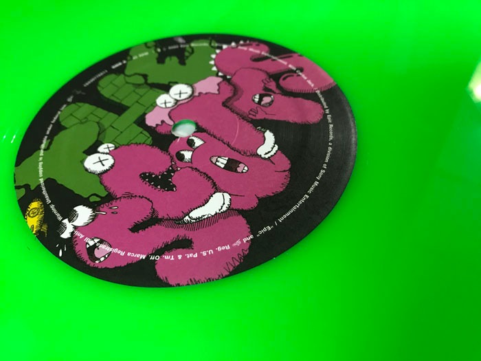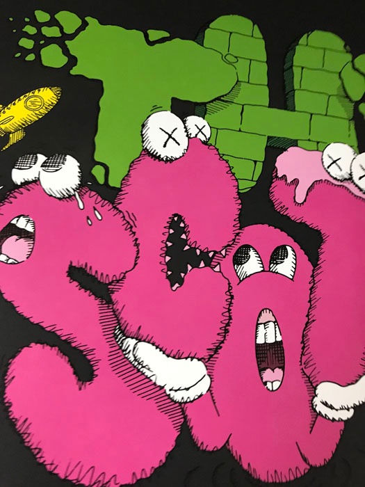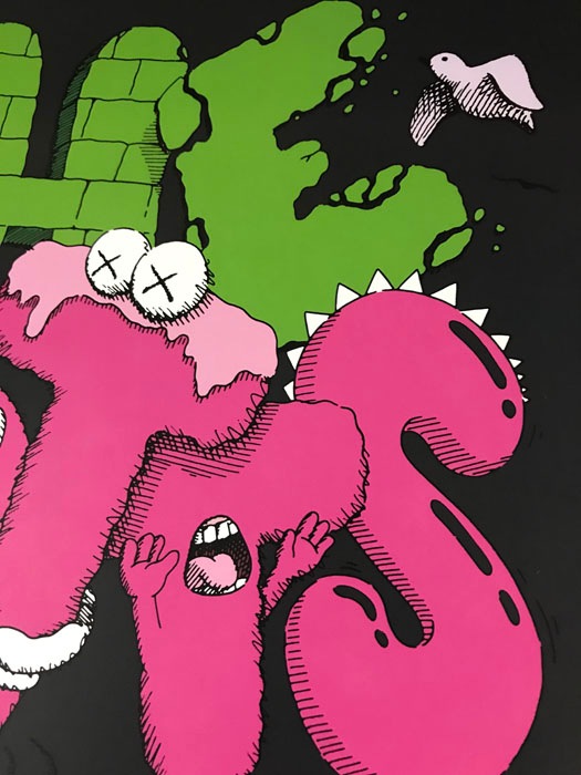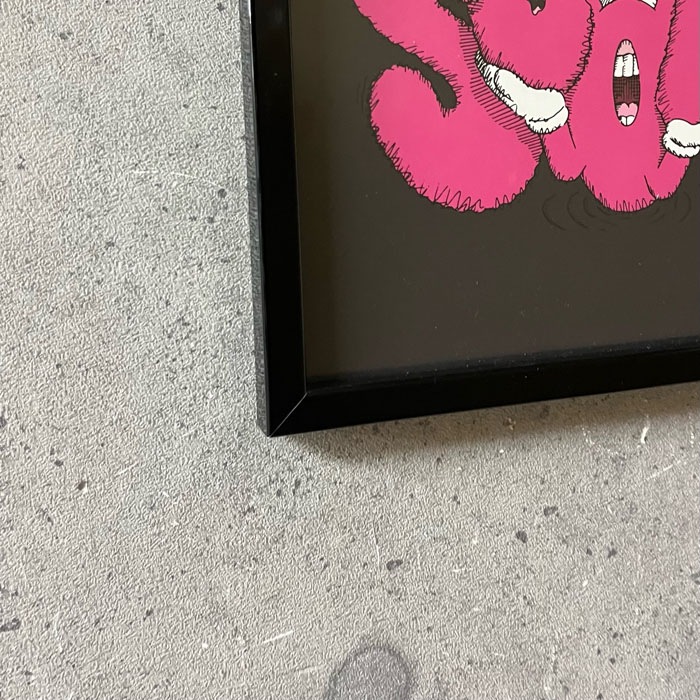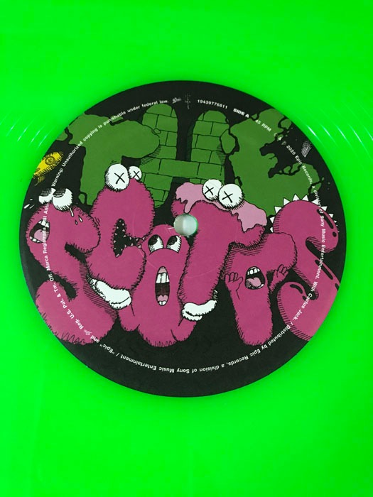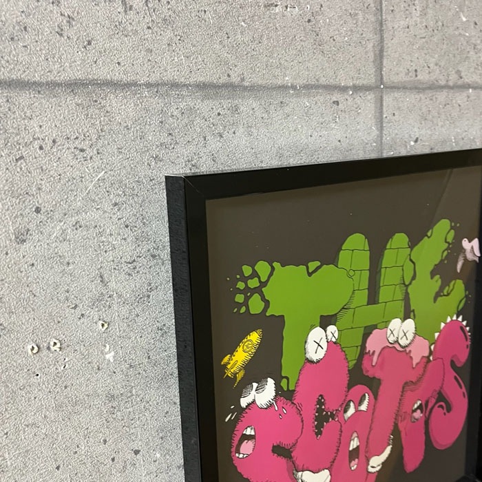 Kaws(ブライアン・ドネリー)1974年ニュージャージー州ジャージーシティー生まれのアーティスト ニューヨークのビジュアルアーツでファインアートを学んだ彼は、1996年に卒業し、フリーランスのアニメーターとしてディズニーアニメーションの背景などを手掛けていました。グラフィティアーティストとしては1990年代初めから活動をはじめ、ニューヨークの街中でビルボードやバス待合所、電話ボックス広告などに落書きするようになりました。彼のグラフィティ作品は、最初のうち誰も見向きもされませんでしたが、だんだん人気が急上昇し始め、彼の作品を捜し求める人々が登場するようになりました。KAWSはミッキーマウスやミシュランマン、スマッフのような親しまれているアイコンを作り直し、自分の作品にしてしまいました。漫画が人々の生活に与える影響の大きさを感じ、それを利用してきたのです。そして、芸術という狭い枠を飛び越えて、より多くの人々を自分の世界に取り込んでいきました。これまでは、芸術と商業主義は相反すると考えられてきましたが、それらの境界を曖昧にさせ、商業的にも芸術的にも、成功することができたのです。こちらは限定で販売されたTRAVIS SCOTTのレコードジャケット作品となりレコードも入っております。
