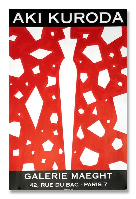 黒田 アキ 日本 【1944-】 京都府の出身で現在はパリ在住、ヨーロッパを中心に活動しながら世界的な評価を得ているクロダアキ。様々な主義・派・形式・様式など、ある意味開拓されつくした感のある今日の絵画というフィールドの中で現代作家たちの一つの命題ともなっている「絵画の終わり方」というものに彼もまた果敢に挑み続けています。一見秩序を保った、安定した構成の中に汲み取れる不安定な要素は、矛盾した世界で震える現代社会への警鐘のようです。そしてその絵には警鐘のみならず、回答にも似たメタファーもまた描かれているのです。こちらのポスターはリトグラフになります。リトグラフ(lithograph):平板印刷の一種で油(インク)の撥水性を利用した印刷方法です。オフセット印刷の原型となる印刷方法で、元々は石(=リト)を原版に使用した為リトグラフと呼ばれますが、現在はより扱いに適したアルミ版が多く使われています。細かい筆致やインクの飛沫など原版の表現を損なう事無く印刷できるのが特徴です。