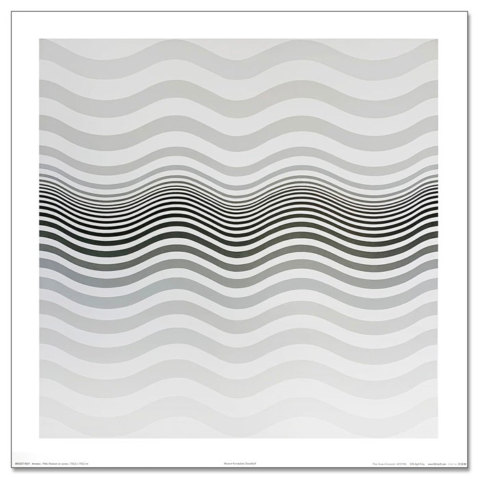 1931年に英国のロンドンで生まれる。 ゴールドスミス美術学校で学んだ後、王立美術学校で学ぶ。1965年にニューヨーク近代美術館(MoMA)で開催されたオプティカル(視覚的)絵画を中心とした最初の国際展「レスポンシブ・アイ」展で注目を集める。 1968年にはヴェニス・ビエンナーレで絵画部門国際賞を受賞。オプ・アートと言われる視覚上の効果を追求する抽象美術の第一人者。オプ・アートとは鑑賞者の視覚を撹乱し、静止したカンバス上に運動を錯覚させようとするアートで、ライリーは白黒をベースにした作品を制作し若くして大いなる名声を得た。そのあとは鮮やかな色彩を取り入れ視覚の振動や律動を音楽や波、光のように表現した。1993年にはオクスフォード大学の名誉文学博士、1995年にはケンブリッジ大学の名誉文学博士となる。 1980年には東京国立近代美術館で大規模な個展を開催。こちらのポスターはオフセットプリントになります。オフセットプリント(offset):平板印刷の一種で油(インク)の撥水性を利用した科学的な印刷方法です。版から紙へ直接印刷するのではなく中間転写体を介す為、版や紙への摩擦が少なく印刷できるのが大きな特徴です。正確で鮮明な多色刷りの印刷が可能で、原版からの再現性が高い事から現代のカラー印刷では最も広く使われています。