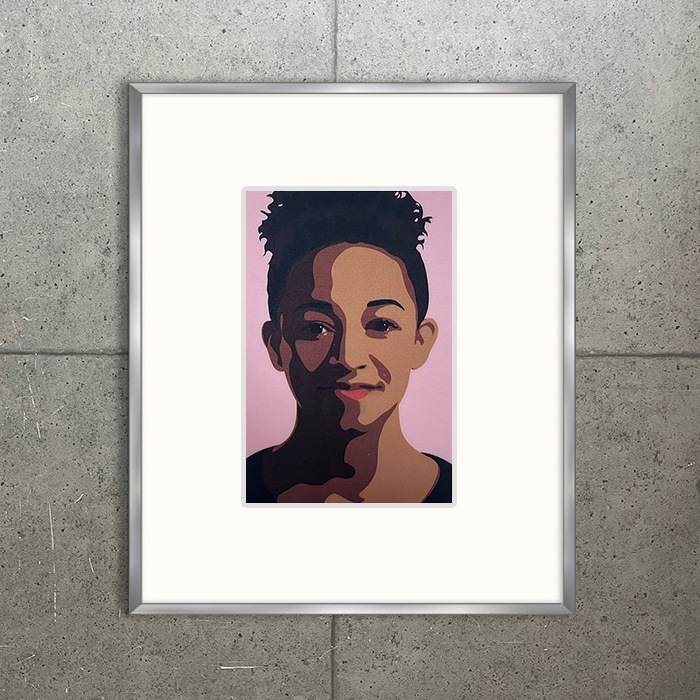 ミニ作品を高級アルミ製フレーム、ホワイトマット加工にて額装しました。こちらはホログラム仕様となり、見る角度によって微笑むように見えます。