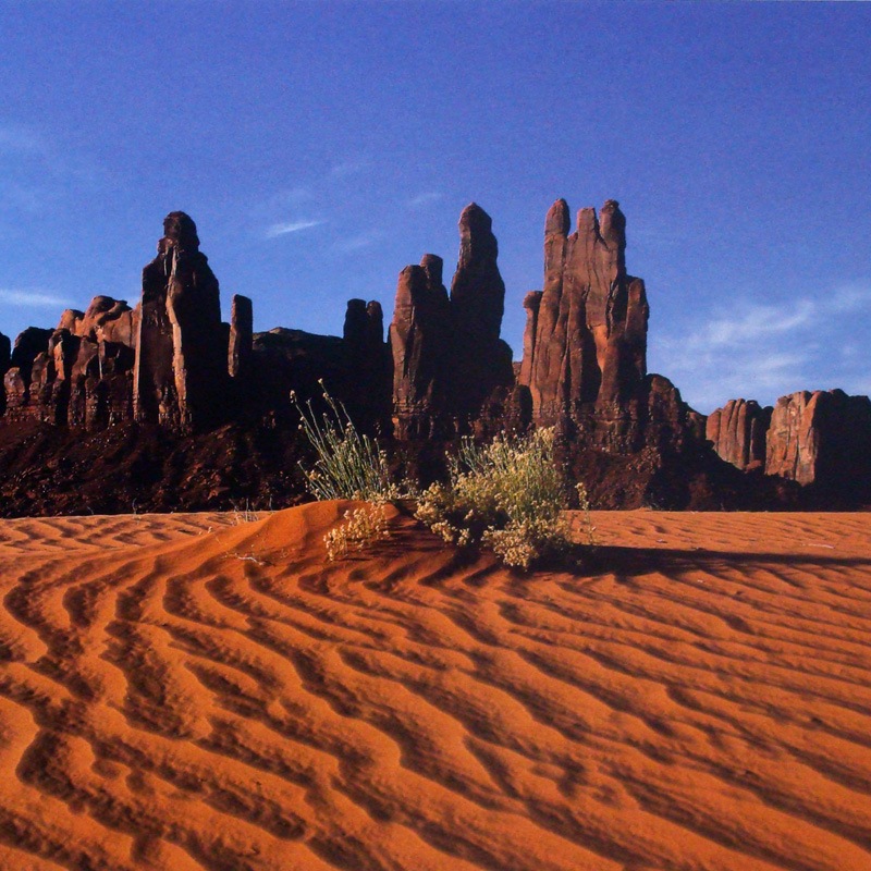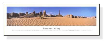 モニュメント・バレーは、米国西南部のユタ州南部からアリゾナ州北部にかけて広がる地域一帯の名称。メサといわれるテーブル形の台地や、さらに浸食が進んだビュートといわれる岩山が点在し、あたかも記念碑(モニュメント)が並んでいるような景観を示していることからこの名がついた。古くからのナバホ族居住地域で、居留地となった現在では、その一部はナバホ族管轄のもと一般に開放する形で公開されており、ナバホ族の聖地とも呼ばれ有名な観光地となっている。モニュメント・バレーは映画の撮影地としても使用される事が多く、『バック・トゥ・ザ・フューチャー PART3』や『フォレスト・ガンプ/一期一会』、『イージー・ライダー』など。映画監督のジョン・フォードは、ジョン・ウェイン主演・西部劇の舞台として多数の映画撮影を当地で行っており、監督が好んで映画カメラを設置したモニュメント・バレーを一望できる場所は、ジョン・フォードポイントと呼ばれ有名なビュースポットとなっている。