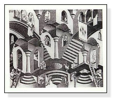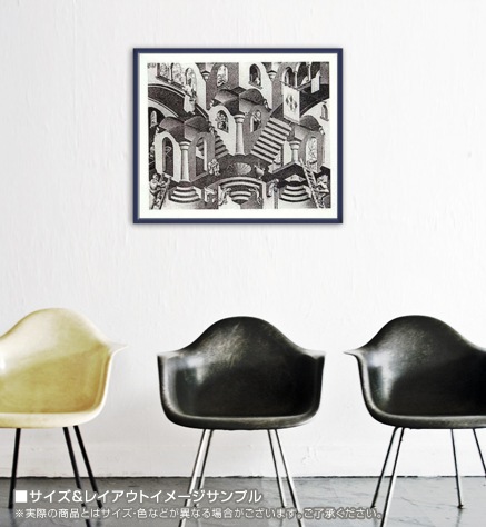 MC エッシャー オランダ 【1898-1972】 エッシャーの作品の最大の特徴は、だまし絵としての空間と非常に数学的・結晶学的なアプローチで描かれた構図にあります。そのタッチから寓話的なイメージも受けますが、そのようなイメージをエッシャー自身はひどく嫌っており、生涯を賭して彼は職人的に「平面の正則分割」「鏡面」「遠近法」など理工的な世界の構築を探究しつづけました。それでも彼の人間性までもが数学的・理工的であった訳ではなく、自然社会に存在する動植物などが作品の多くのモチーフになっており、エッシャーの豊かな人間性が汲み取れます。