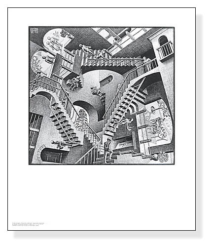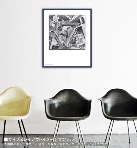 MC エッシャー オランダ 【1898-1972】 エッシャーの作品の最大の特徴は、だまし絵としての空間と非常に数学的・結晶学的なアプローチで描かれた構図にあります。そのタッチから寓話的なイメージも受けますが、そのようなイメージをエッシャー自身はひどく嫌っており、生涯を賭して彼は職人的に「平面の正則分割」「鏡面」「遠近法」など理工的な世界の構築を探究しつづけました。それでも彼の人間性までもが数学的・理工的であった訳ではなく、自然社会に存在する動植物などが作品の多くのモチーフになっており、エッシャーの豊かな人間性が汲み取れます。