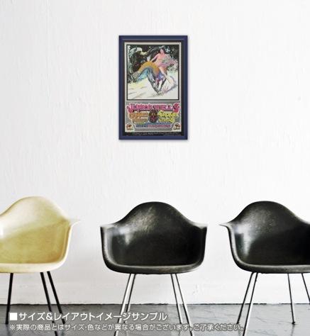 こちらのポスターはリトグラフになります。リトグラフ(lithograph):平板印刷の一種で油(インク)の撥水性を利用した印刷方法です。オフセット印刷の原型となる印刷方法で、元々は石(=リト)を原版に使用した為リトグラフと呼ばれますが、現在はより扱いに適したアルミ版が多く使われています。細かい筆致やインクの飛沫など原版の表現を損なう事無く印刷できるのが特徴です。